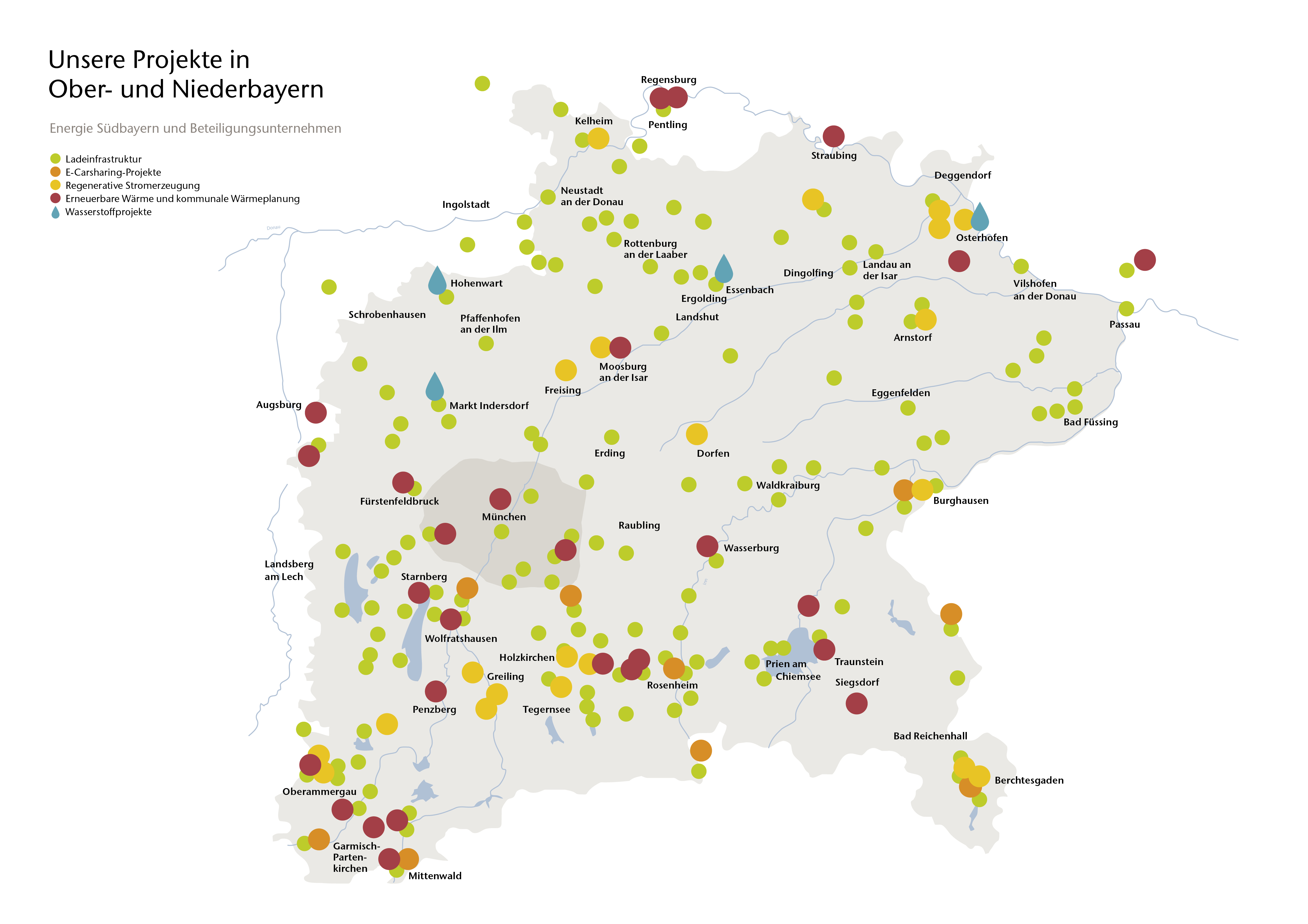 Gemeinsam mit unseren Tochter- und Beteiligungsunternehmen packen wir die Energiewende vor Ort an. In Ober- und Niederbayern setzen wir zahlreiche Projekte aus den Bereichen Stromerzeugung, Elektromobilität, erneuerbare Wärme und Gasversorgung mit Wasserstoff und Biogas um.