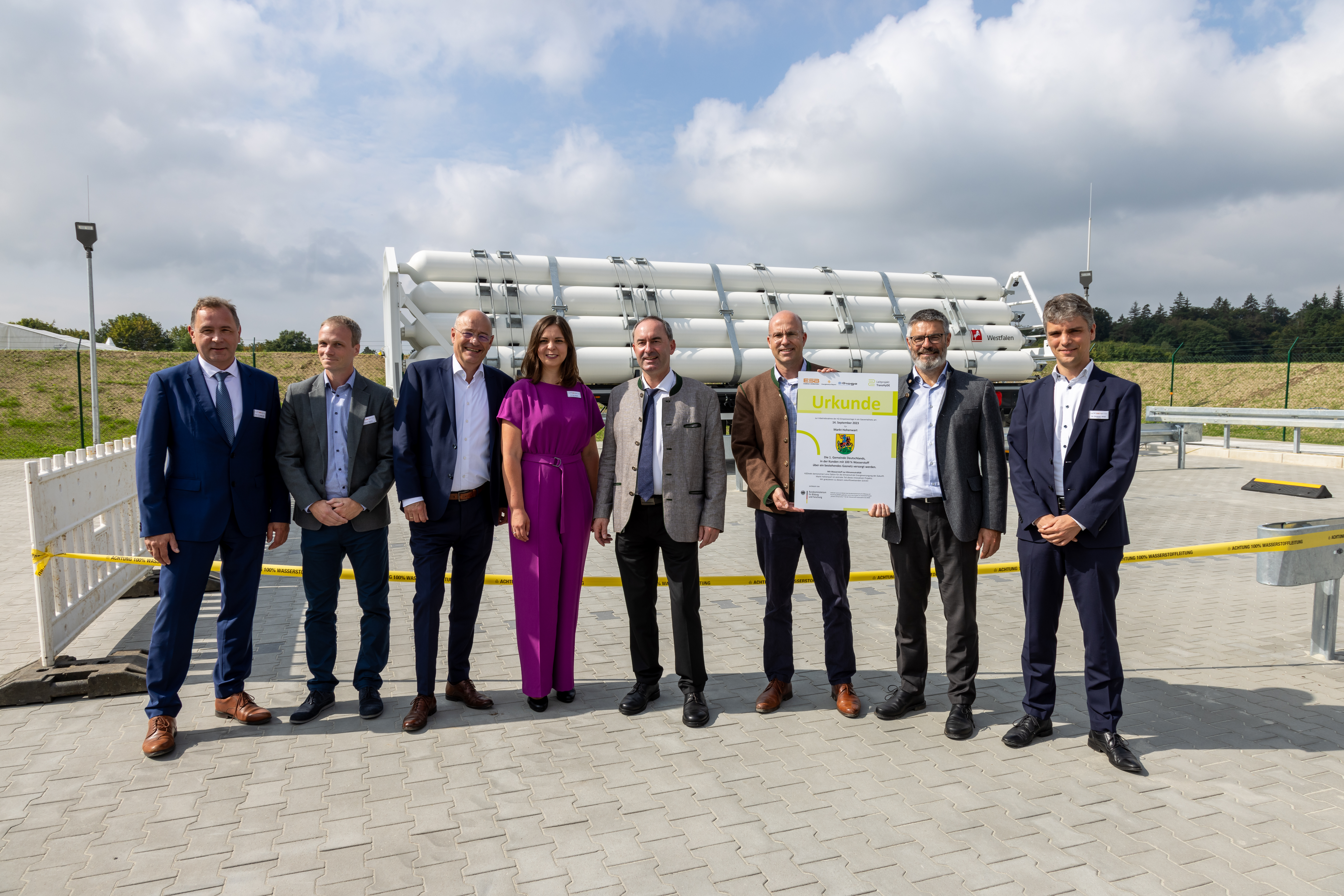 Elf Wasserstoff-Pioniere in Hohenwart (Landkreis Pfaffenhofen a. d. Ilm) heizen nun mit reinem Wasserstoff. Dafür wurde ein bestehender Abschnitt des Erdgasnetzes abgetrennt und in diesem Bereich mit 100% H2 beaufschlagt. Eine „Blaupause für die Energiewende in ganz Deutschland“ nannte Bayerns Wirtschaftsminister Hubert Aiwanger das Wasserstoff-Projekt. Er kam zum offiziellen Startschuss der Wasserstoff-Einspeiseanlage im September nach Hohenwart. Aiwanger weiter: „Wenn das für zehn angeschlossene Kunden funktioniert, dann geht es auch für 1.000, dann geht es auch für 100.000.“