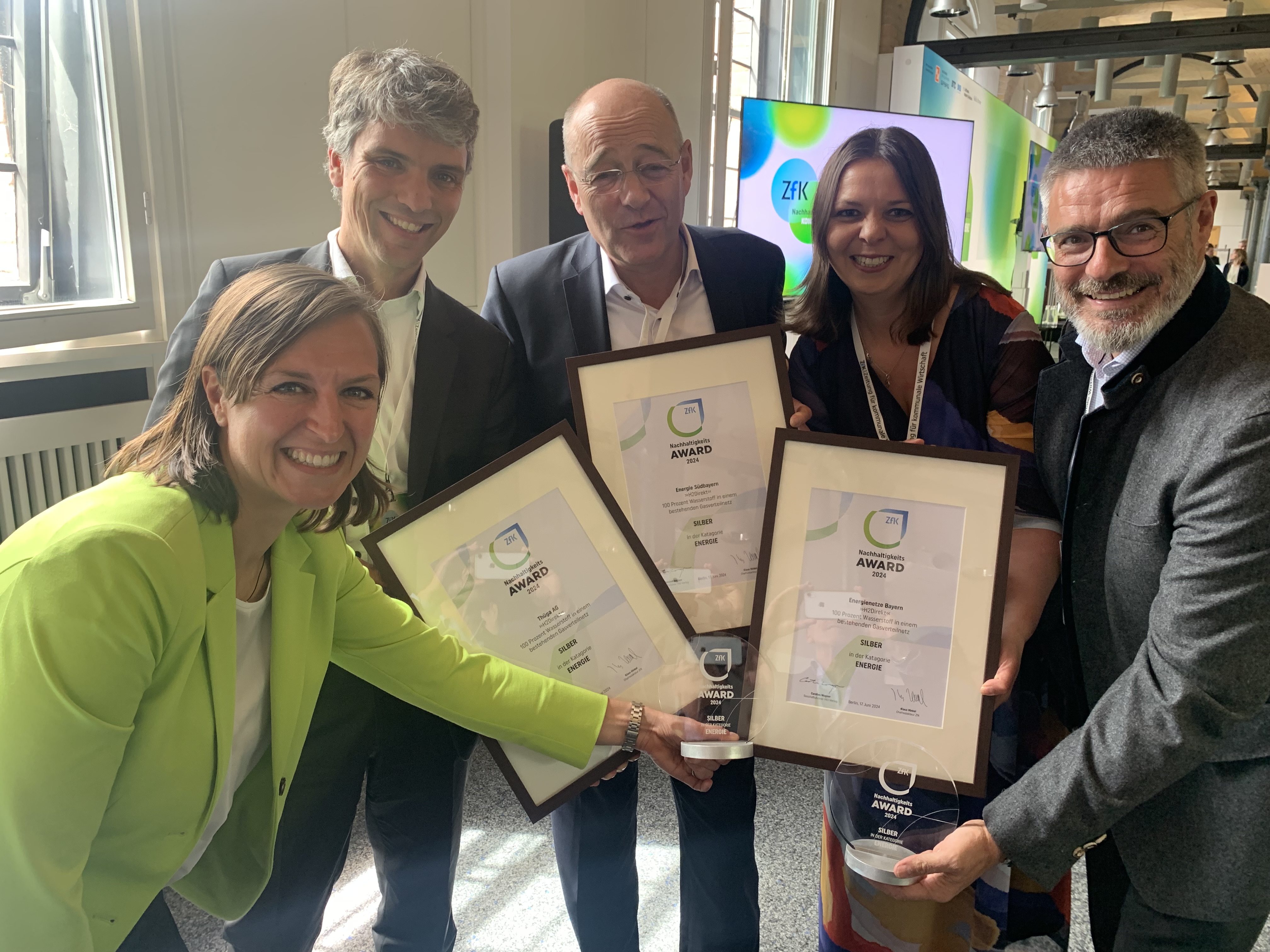 Das Wasserstoff-Leuchtturmprojekt von Energie Südbayern, Energienetze Bayern und Thüga gewinnt Silber beim ZfK-NachhaltigkeitsAWARD 2024 in der Kategorie „Energie“.